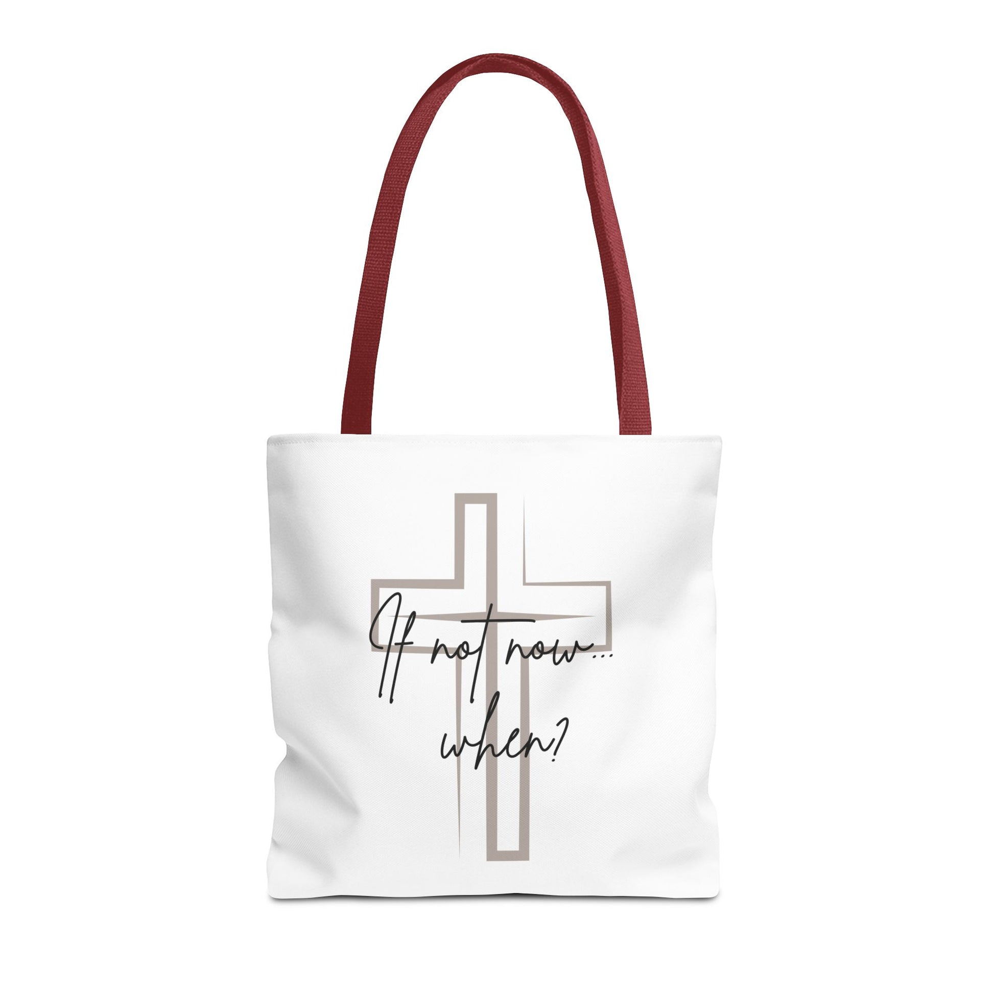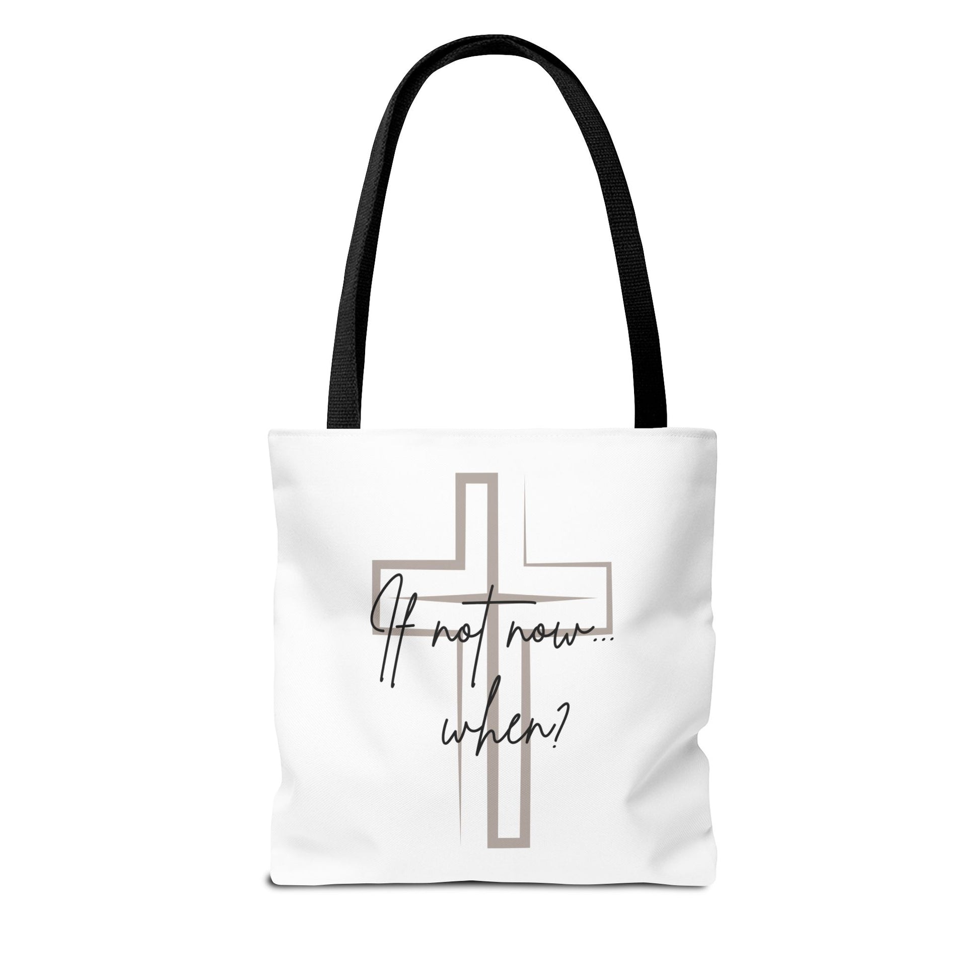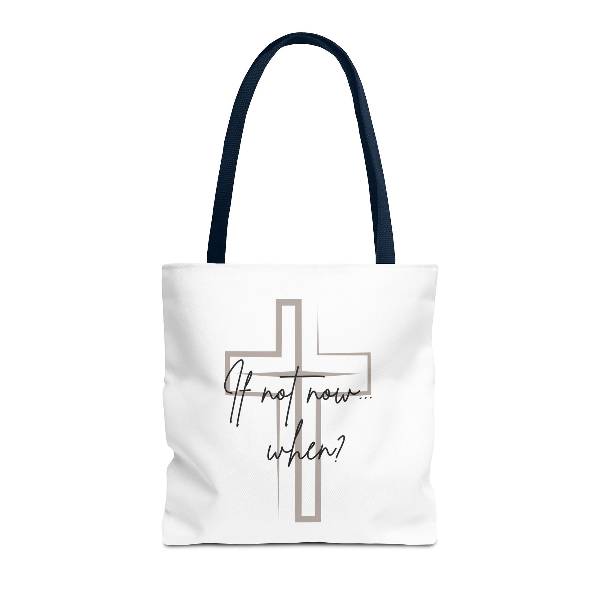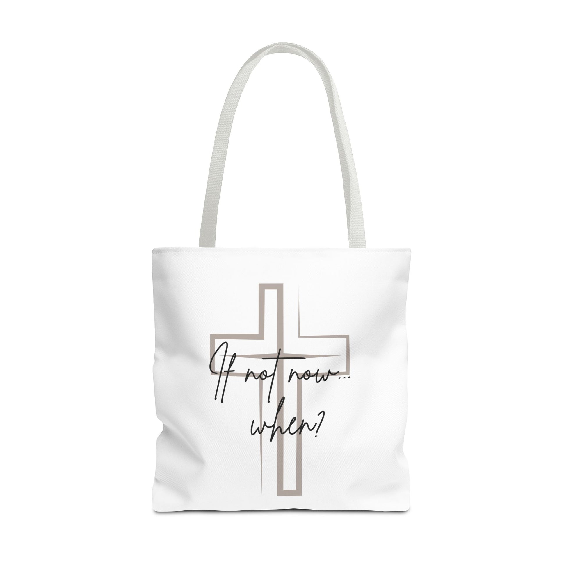 Carry your faith wherever you go with this beautifully designed tote bag featuring the bold reminder: “If not now… when” — a call to action rooted in purpose and spiritual courage. The subtle cross on the back adds a quiet yet powerful symbol of belief, making this bag more than just an accessory — it’s a statement of faith.