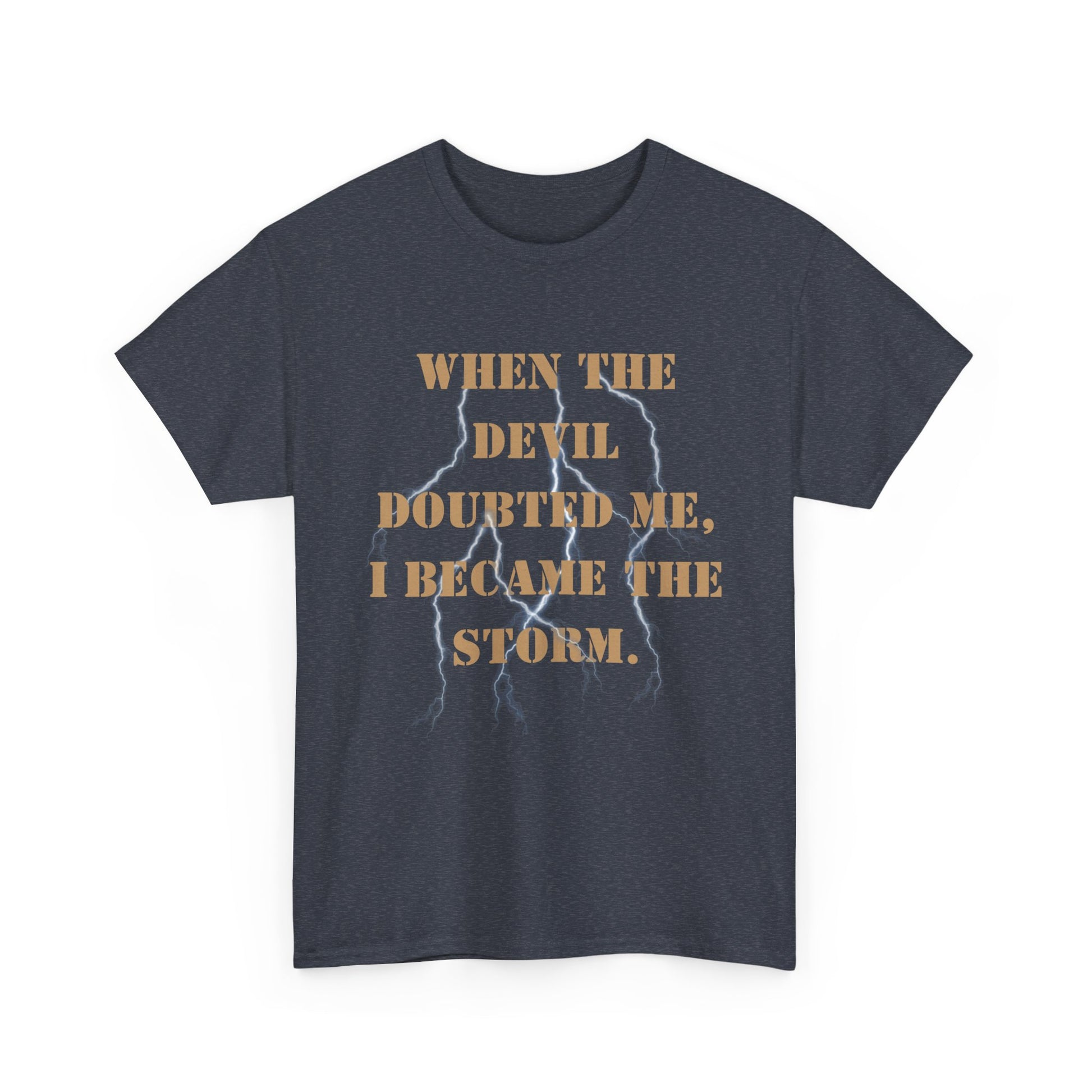 Honor the legacy of U.S. Navy veterans with this bold, dual-sided tribute tee. Featuring the powerful quote “WHEN THE DEVIL DOUBTED ME, I BECAME THE STORM” on the front and a striking anchor-and-flag design on the back, this shirt commemorates Desert Storm service with pride and grit. Available in five colors and unisex sizing, it’s perfect for Veterans Day, reunions, or everyday wear.